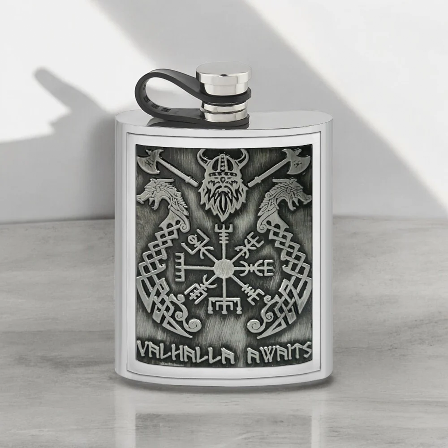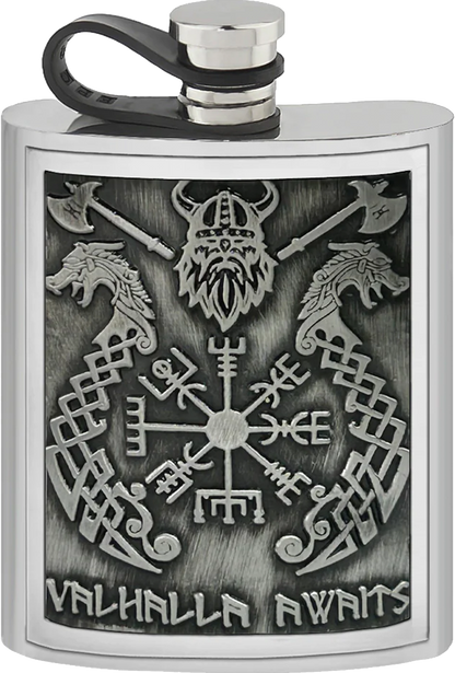 Striking Design: 6oz Pewter Hip Flask featuring a handcrafted "Valhalla" themed badge inspired by Norse mythology, crafted from high-quality pewter with a timeless lustrous finish.