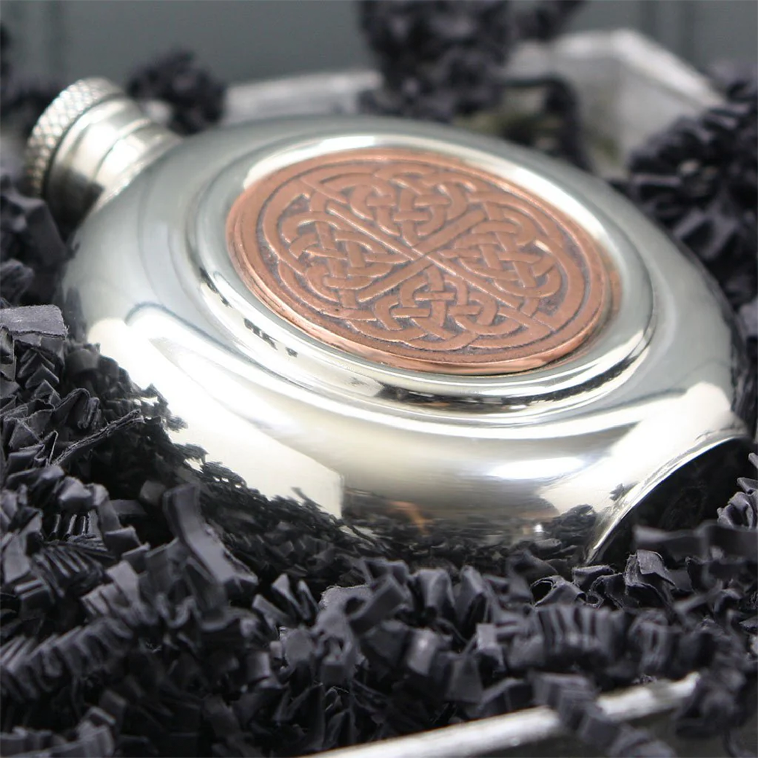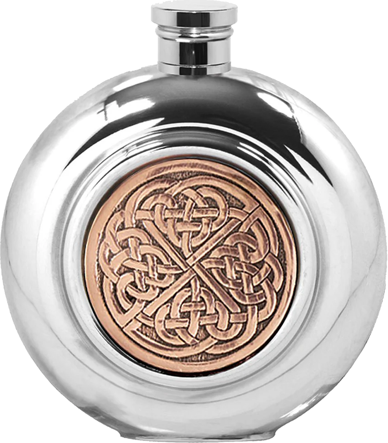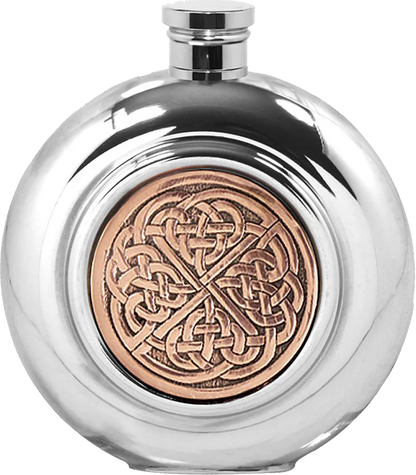 Circular pewter hip flask featuring a striking copper-plated Celtic knot badge that contrasts beautifully with its polished mirror finish.