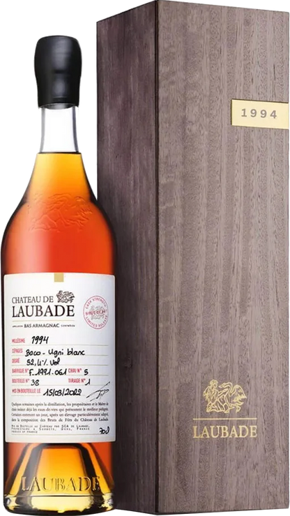 Chateau de Laubade is an agricultural and winegrowing estate located in Sorbets, in the Gers, in the heart of the finest Bas Armagnac terroir. The 105 hectares estate in a single block around the chateau, built in 1870, it has been owned by the Lesgourgues family for three generations. Today, Denis, assisted by his sister, Jeanne, and brother, Arnaud, continue their family's constant striving for excellence, with the aim of producing the most outstanding Armagnacs. Appearance: Dark amber with intense brilliance. Nose: Powerful and complex, with dried fig, cinnamon bark, toasted almond, and vanilla pod. Palate: Bold and structured, with layers of dried fruit, dark chocolate, and cracked pepper. Finish: Long and assertive, with a pleasantly warm, spicy tail. Overall: A high-strength vintage for the serious enthusiast - robust, layered, and full of energy.