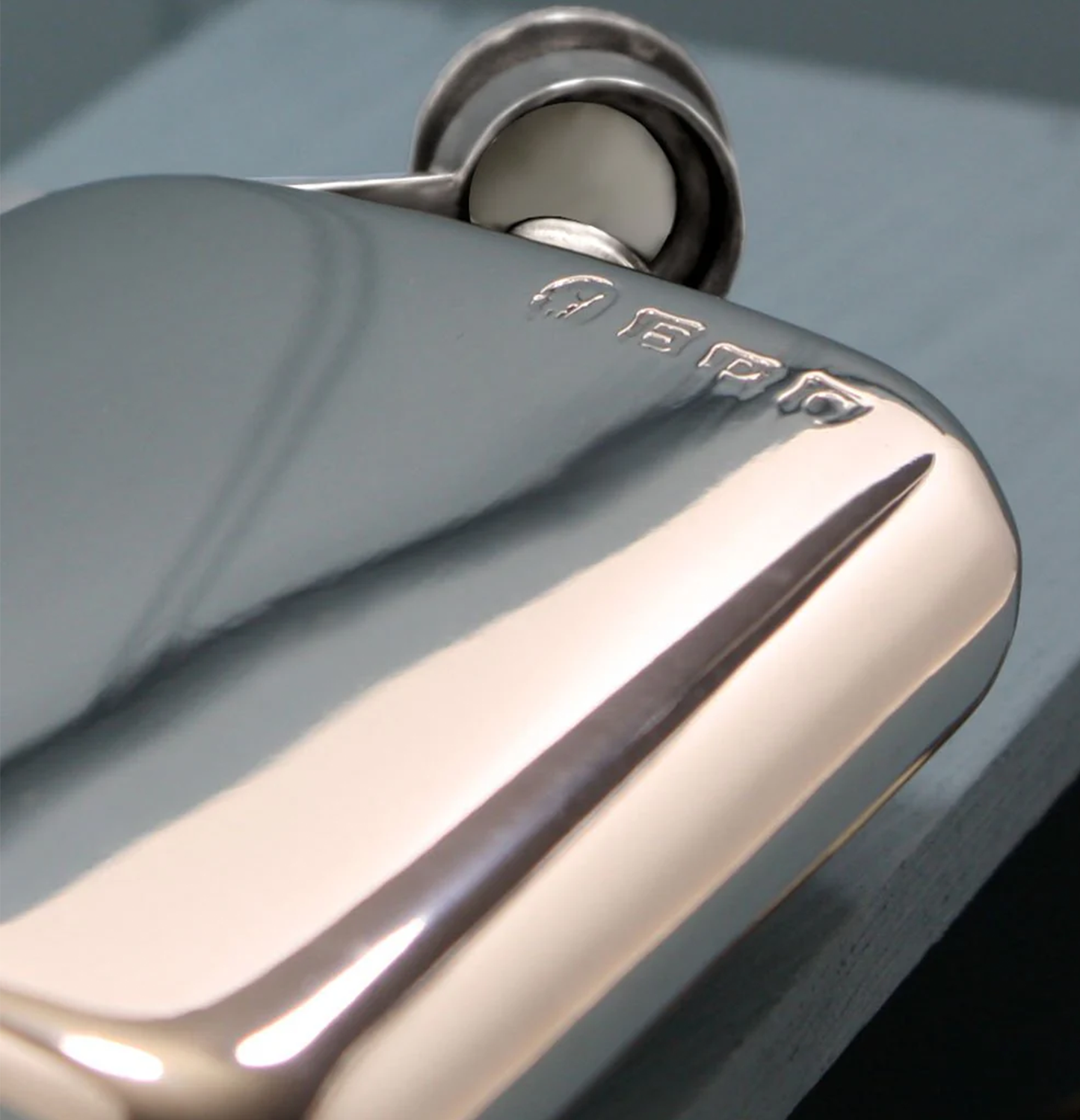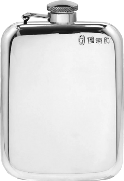 Timeless pewter hip flask with a simple, elegant design, featuring the English Pewter Company touchmark and a hinged captive top.
