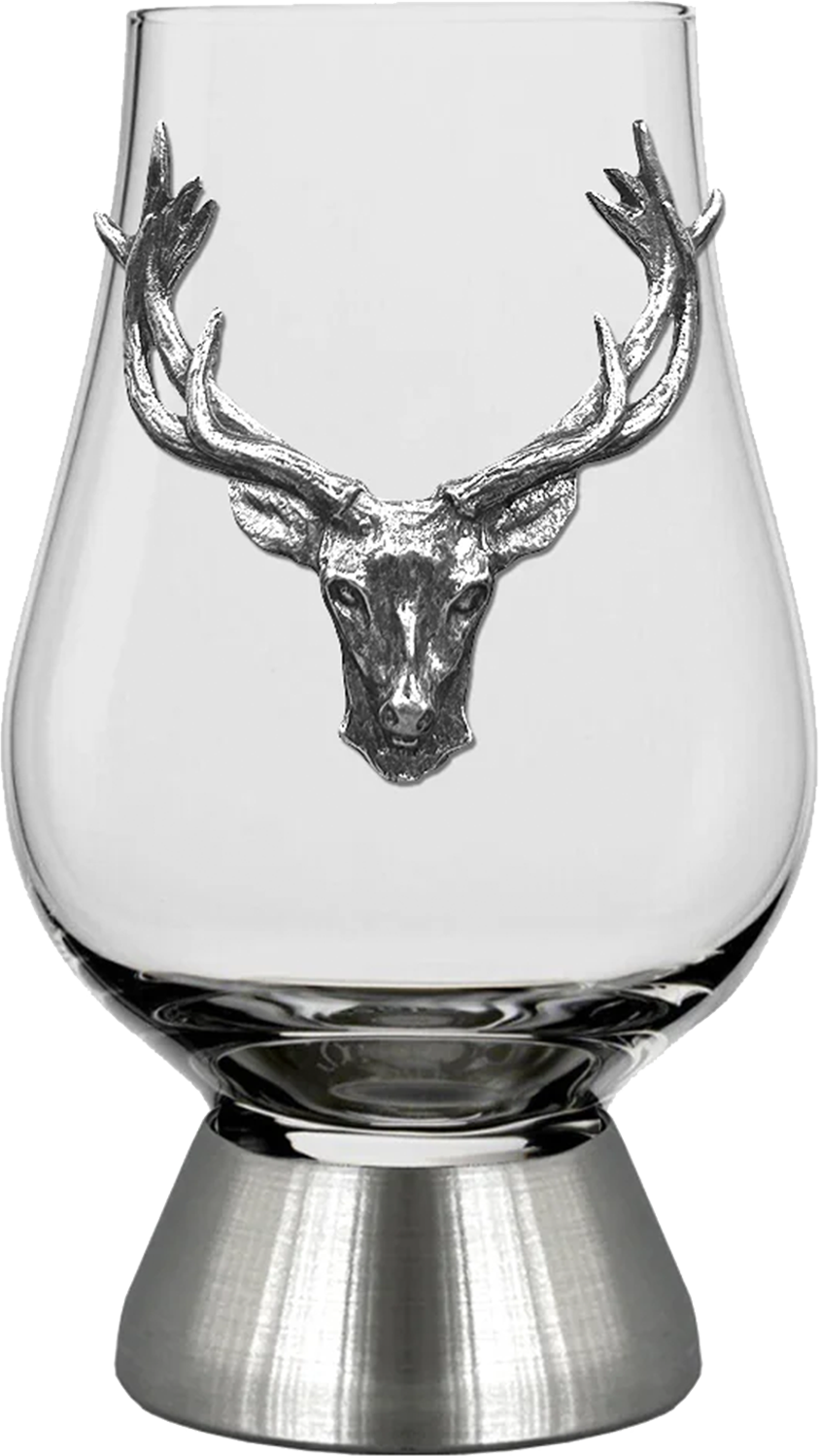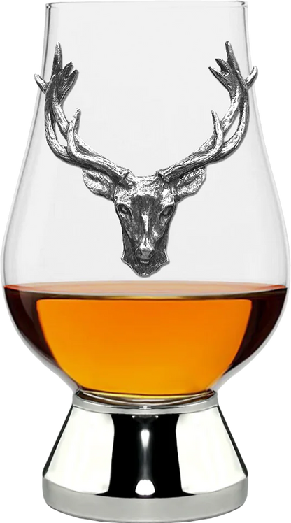 Sophisticated Craftsmanship: 200ml Glencairn Crystal Glass featuring a handcrafted pewter base and a striking pewter Stag Head, blending traditional artistry with modern elegance.