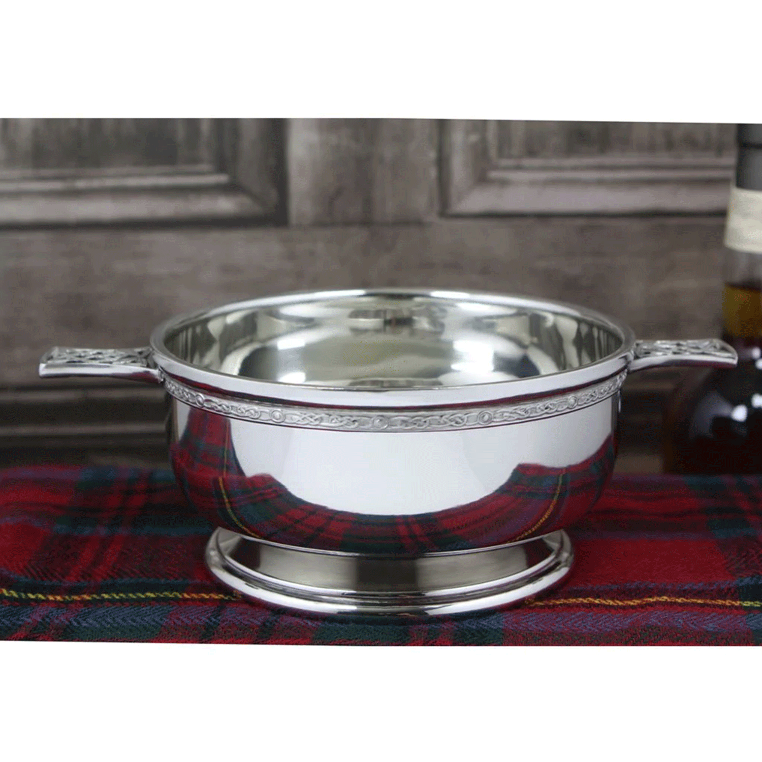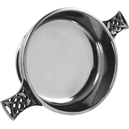 Beautifully crafted pewter Quaich with a polished bowl, Celtic Knot-style handles, and intricate Celtic banding for a traditional and elegant design.